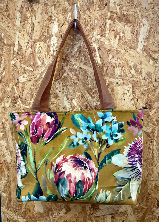 Cycle Up (Roscommon Womens Network) Tote Bag - Brown Leather/Painted Florals/Mustard