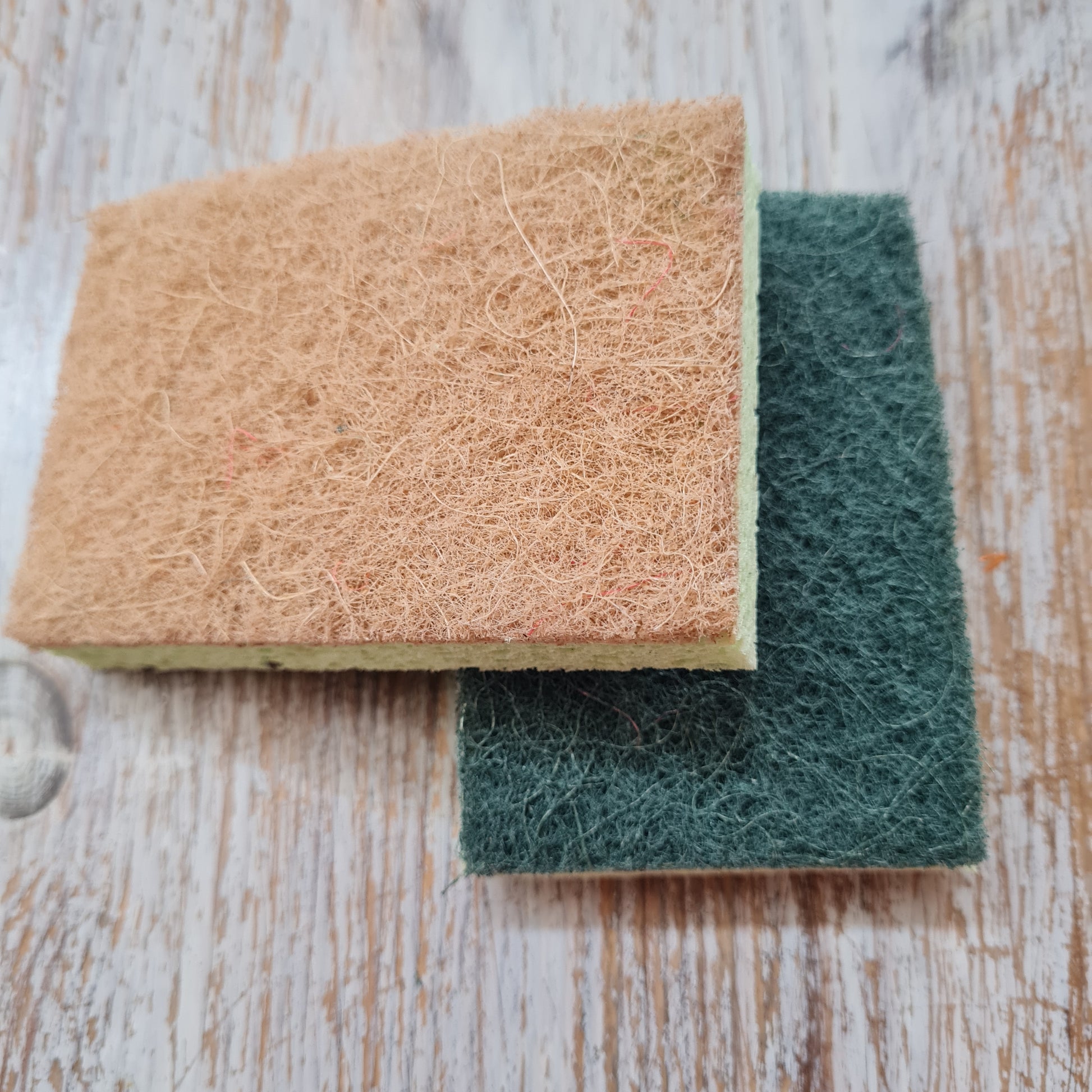 ideal on even heavily soiled dishes and surfaces - without scratching! In addition, they convince with their resource-saving materials. The highly absorbent side of both the dishwashing and scouring sponge is made from 100% plant-based cellulose, while the scouring side is made from strong sisal fibers from the agave plant and fibers from recycled post-consumer PET bottles. Sisal fiber is naturally extremely robust and hard-wearing and is therefore ideal for longer cleaning operations. To increase the scouring performance, small mineral grains are also woven into the robust side of the scouring pads. W 6.5 x D 9.8 x H 1.8 cm. 1 pack = 2 pieces.