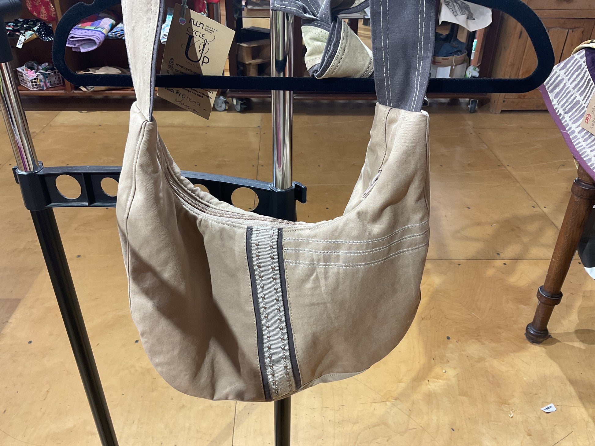 Hand-made cream slouch bag made from recycled materials at Cycle Up, by the Roscommon Womens Network.