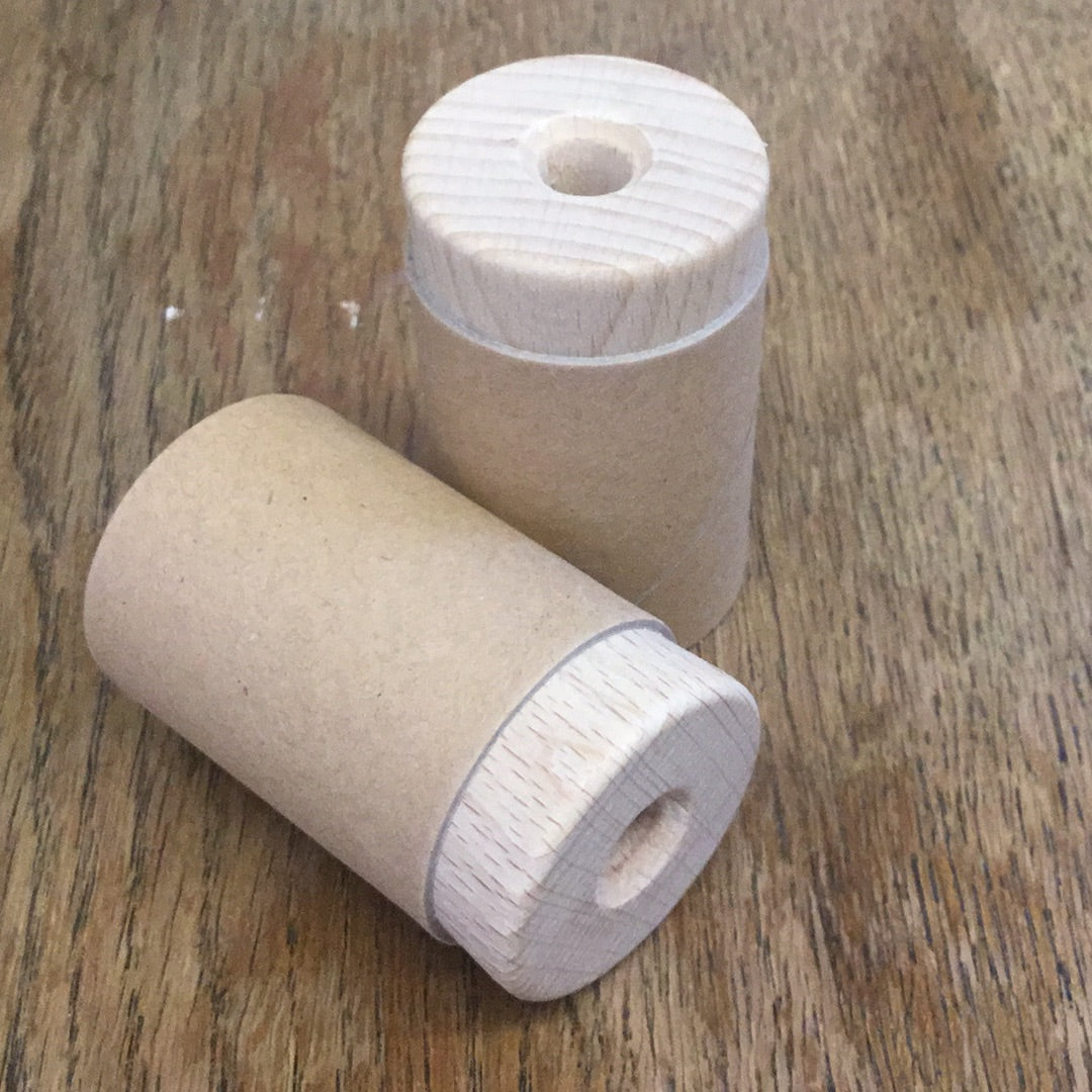 Wooden pencil sharpeners with cardboard canister for mess-free sharpening.