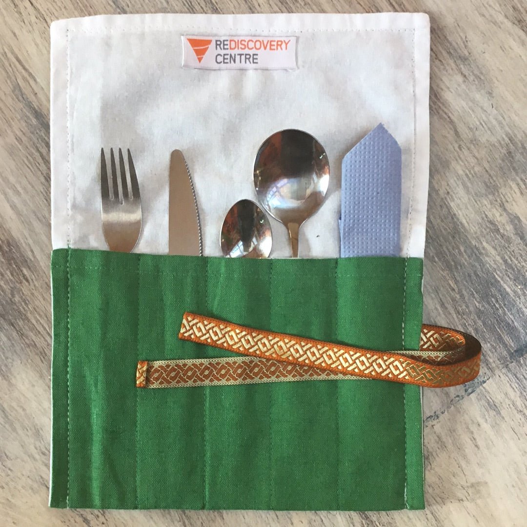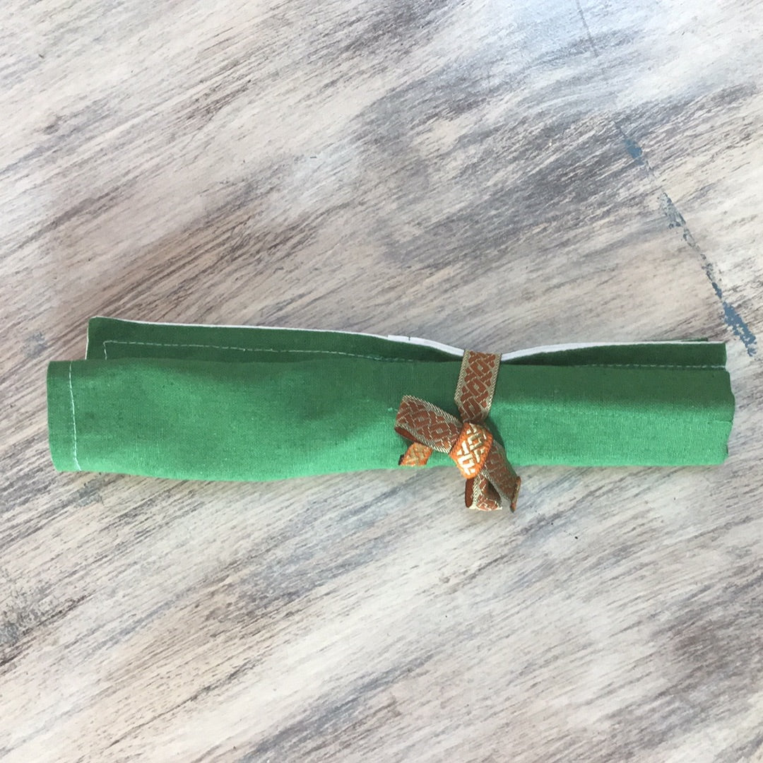 Hand-made pouches made of recycled fabric, perfect for carrying makeup, cutlery, or even stationary. Doubles as a table mat, and can be tied so that everything stays in place.