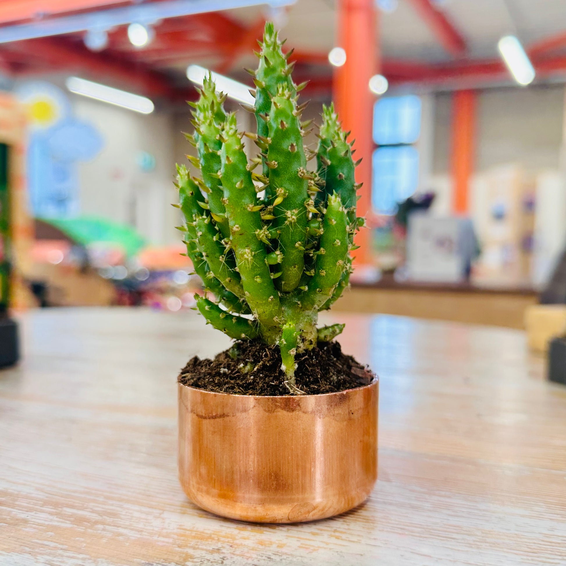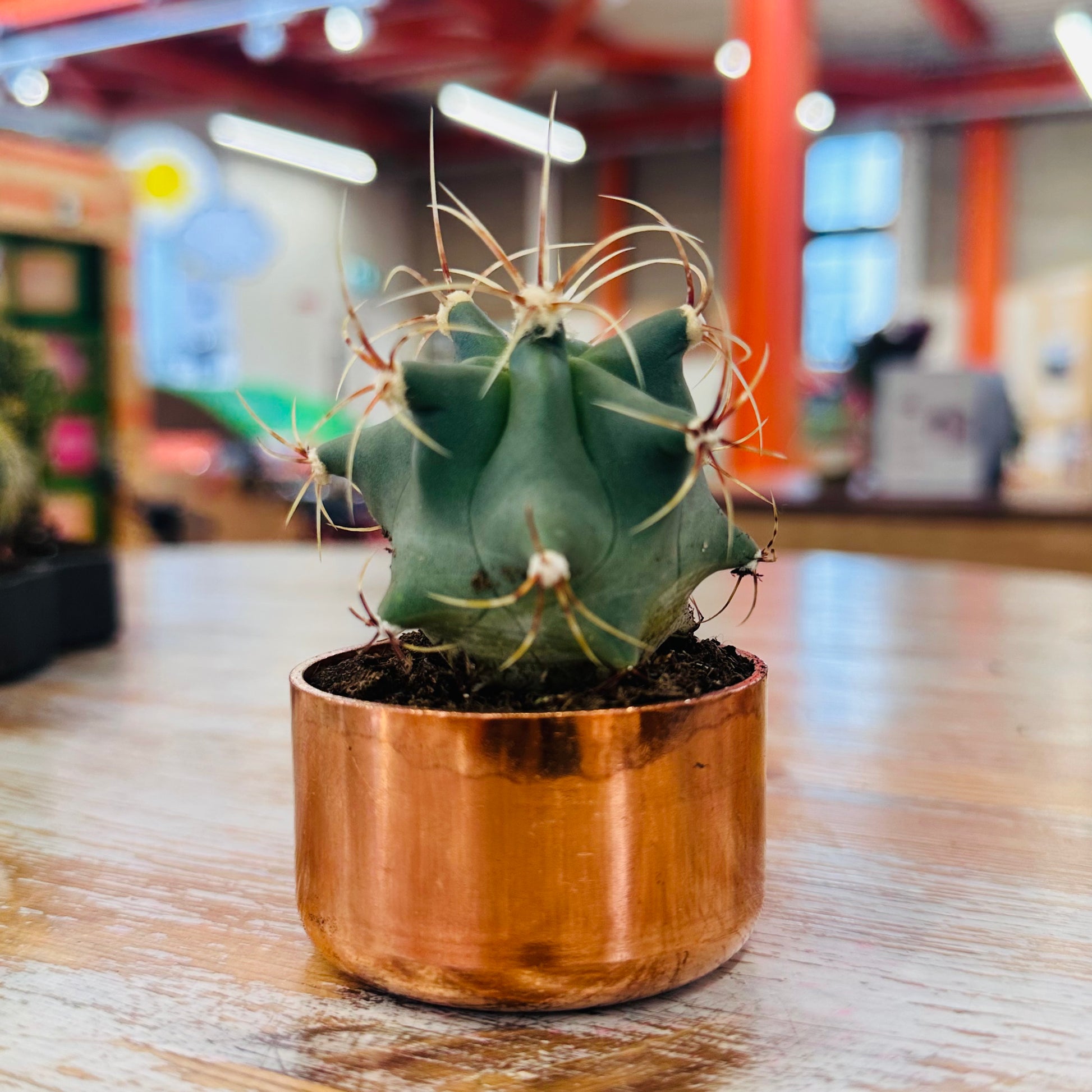 A beautiful solid copper planter. These are plumbing fitting that have been adapted as planters for small cacti and succulents. These planters are industrial in design and would be a perfect addition to any industrial themed decor. The copper is hand polished to a natural finish that will age and develop character over time. They come with a small cacti or succulent at random from whats available at the time! Sold individually or in sets of 3!