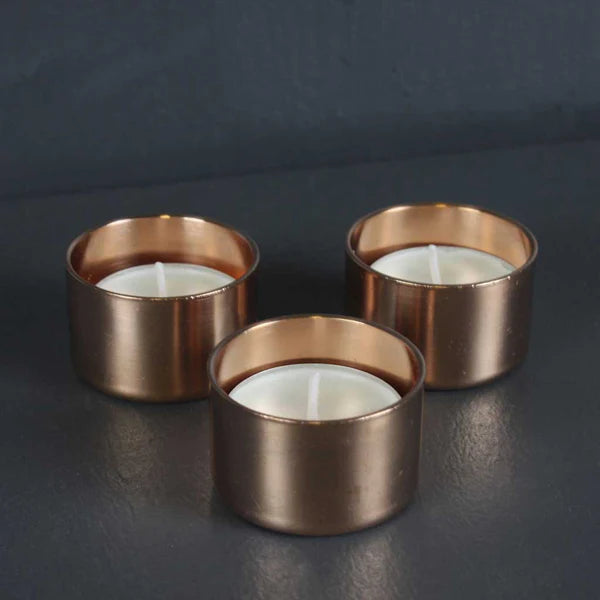 A beautiful set of 3 Copper Tea Light Holders. These are plumbing fitting that have been adapted as a set of tea light holders. Once the tea light is lighting there is a beautiful reflection from the copper. These holders are industrial in design and would be a perfect addition to any industrial themed decor. The copper is hand polished to a natural finish that will age and develop character over time.