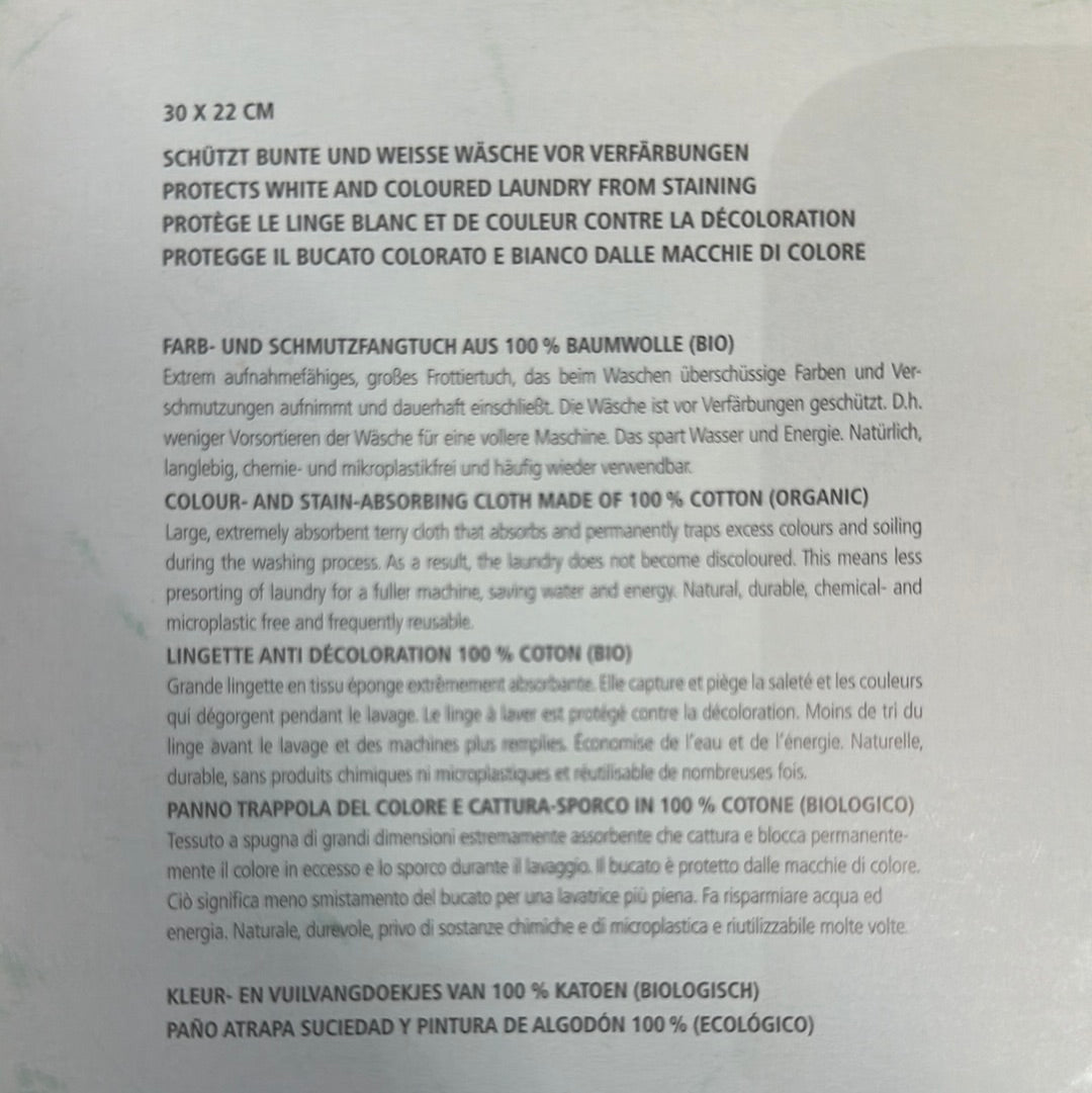 Large, extremely absorbent terry cloth that absorbs and permanently traps excess colours and soiling during washing process. As a result, the laundry does not become discoloured. This means less pre-sorting of laundry for a fuller machine, saving water and energy. Natural, durable, chemical and microplastic free and totally reusable.