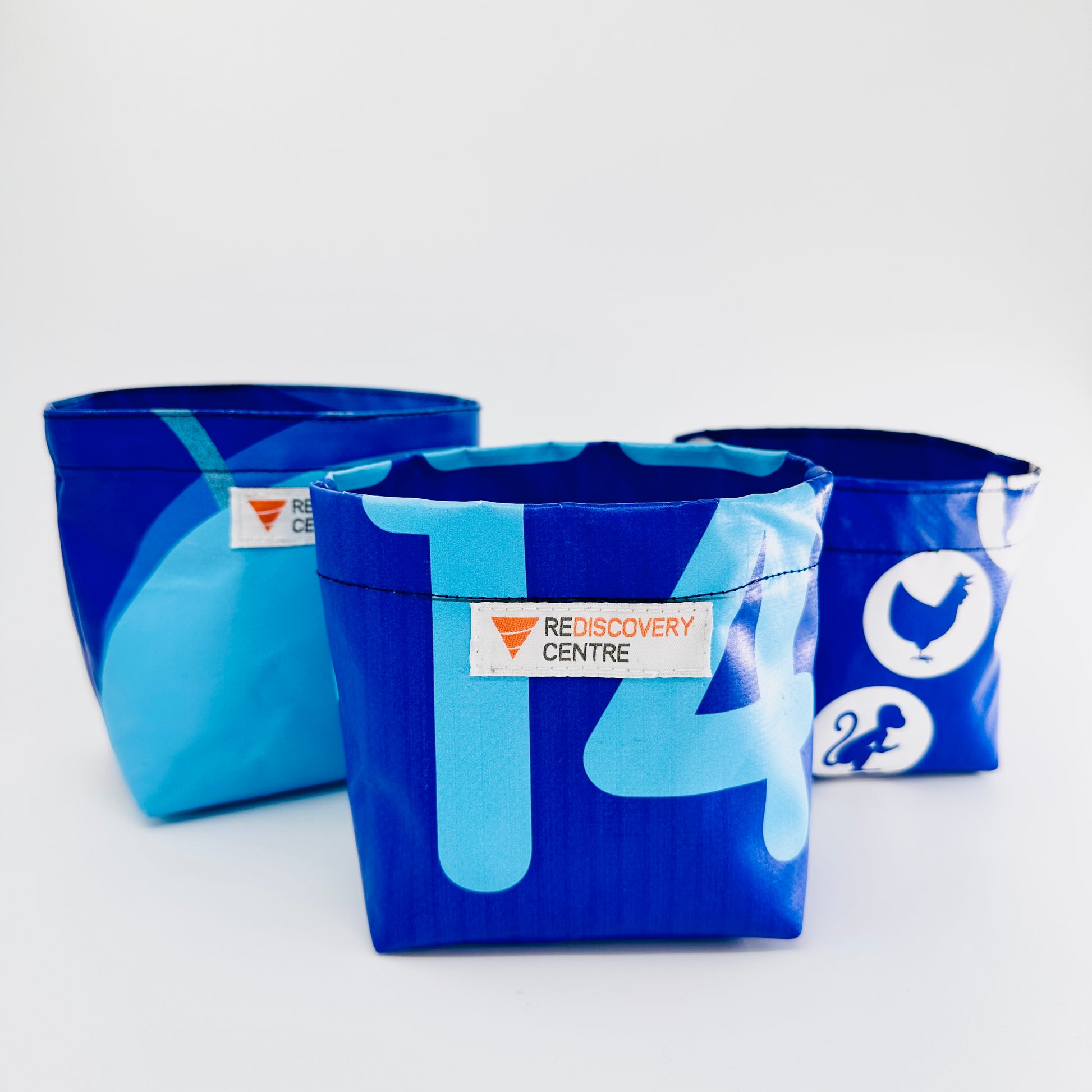 Small plant pots made from upcycled banners. Can be used to hold stationary or to store other things.